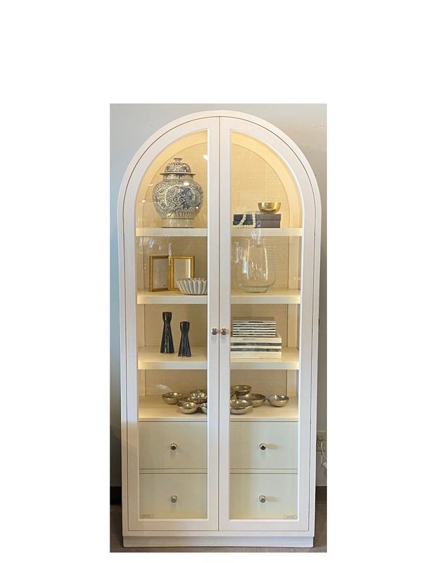 The Newbury Arched Cabinet offers clean lines and textural interest to frame and style your shelf display as intentionally as you style the room it’s in. The arched shape is timelessly classic, yet rendered with modern simplicity – it can just as easily belong in your living room or entryway as in your dining room. Use the built-in lighting and striae-patterned back panel as the stage for your special pieces. Enjoy 2 drawers of storage below the shelves, and full length glass doors to protect your stored as well as displayed items. The cabinet is offered in both a natural finish and Newbury’s signature hatched-gesso finish which is shown here.