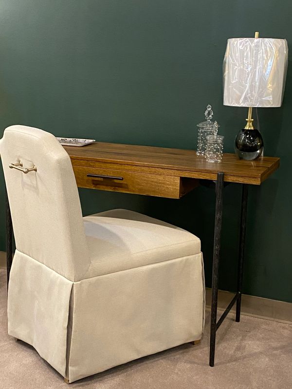 You'll be sitting pretty in this versatile, elegant chair. Perfect for a dining table, vanity, or, as shown here, a writing desk. Notched sides and a fully skirted base create a clean, sophisticated look. With a functional handle on the back and upholstered in a durable, easy-care performance fabric, it's designed for both style and convenience.
